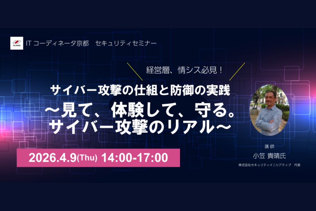 対象:企業の情報セキュリティ・情報システム室関係者、経営層 日時:2026年4月9日(木) 14:00~17:00 場所:ハートピア京都 第3会議室(対面のみのセミナーとなります) 講師:小笠貴晴氏(株式会社セキュリティ […]
